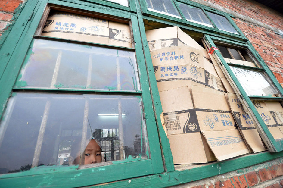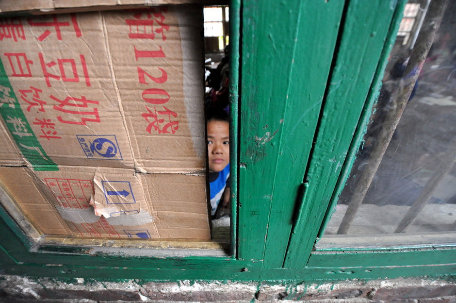 12月7日,广西柳州,柳北区行知小学里,一名小学生从一面满是补丁的教室窗户里向外张望。
