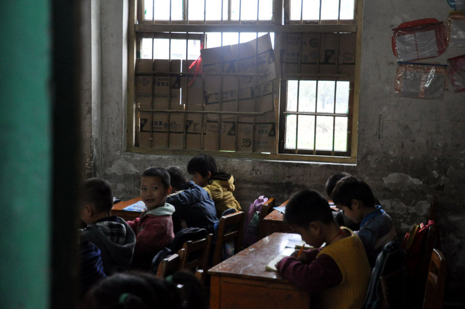 12月7日是二十四节气的大雪,受强冷空气影响,广西柳州气温降到10℃以下,并伴随3级北风和小雨。由于年久失修,行知小学每个教室都有窗户玻璃破烂,特别北面的几个教室窗户遭破坏最为严重,几乎看不到完整的窗户。为抵御突如其来的强冷空气,当天该校老师赶紧拿来一些废旧纸箱,叠着成硬纸片把窗口封上。然而依然有寒风从缝隙间吹进来,被封死的窗户也使得教室变得昏暗,影响学生视力。图为一名小学生从一面满是补丁的教室窗户里向外张望。