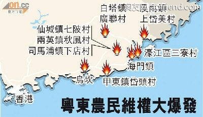 「新农民运动」之火延烧粤东,图为各地维权示威浪潮的位置标示。(香港东方日报提供)