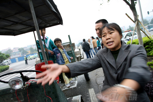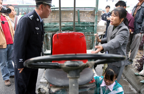 小女孩哭泣着,双手紧紧地抓着爸爸的拖拉机,她不能让交警将车拖走。