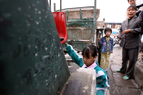 两个女孩死死地抓住爸爸的车子,保卫爸爸的“饭碗”。