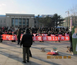 而在同一时刻,山东烟台市的企业军转干部、转业志愿兵、参战老兵及其他转复退役军人聚集在烟台市文化广场,纪念毛泽东冥诞。参加活动的王秋兰对记者说:“今天烟台市的军转干部到文化广场去搞纪念毛主席诞辰118周年活动。有讲话,讲了一些要求落实政策的一些问题。今天去的差不多到最后人员逐渐增加到一千来人。打着四个横幅标语还有一些展板”。