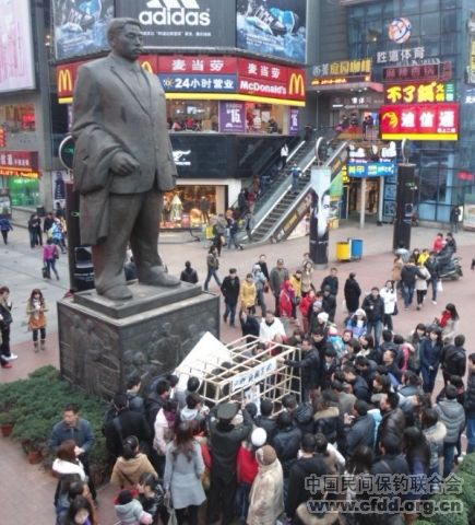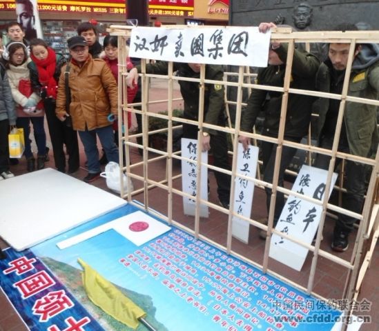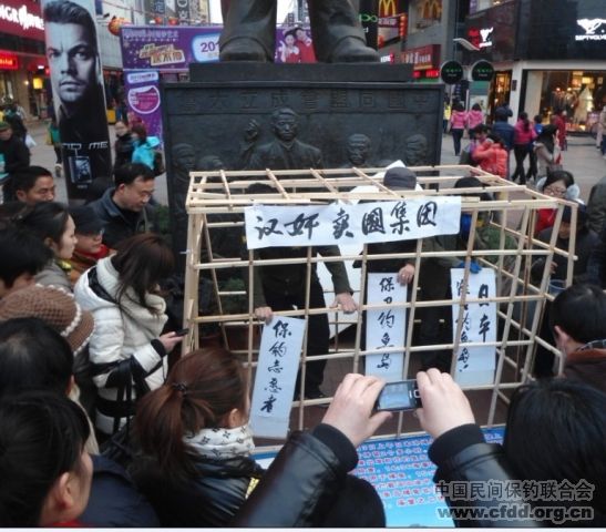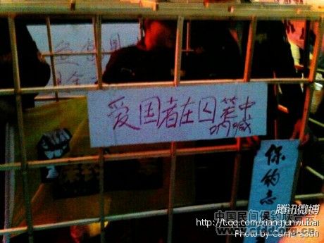 元月4日下午湖南长沙“保钓湘军”的爱国宣传用行为艺术——在大街上保钓志愿者把自己关在一个大笼子里表达中国爱国者的无奈。
