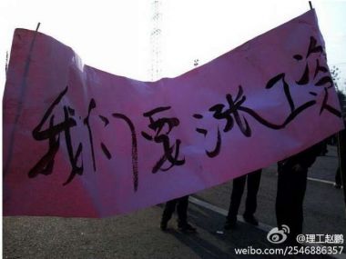 涨工资的要求被工人写在条幅上,惨烈显眼。