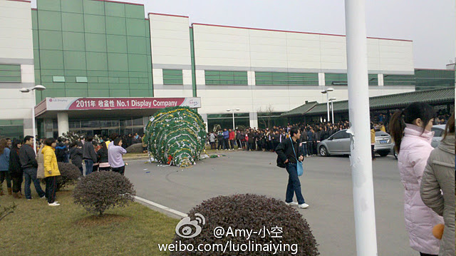 2011年12月26日,韩资LG Display南京厂,5个工厂、七八十条生产线共八千员工全部停工,要求补发年终奖。韩国LG普通员工工资六个月双薪,中国员工却没有年终奖,使员工愤怒不已,八千人集体罢工抗议。早上10时,4厂集体在操场罢工。下午2时,1、2、3厂和中小型厂也集体在操场罢工。愤怒员工掀翻食堂的桌椅,大门口的圣诞树也被推倒。来了一些警察,全部被工人哄走。