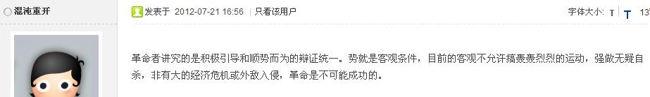 革命者讲究的是积极引导和顺势而为的辩证统一。势就是客观条件,目前的客观不允许搞轰轰烈烈的运动,强做无疑自杀,非有大的经济危机或外敌入侵,革命是不可能成功的。