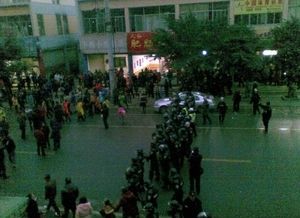 连日来,攀钢集团成都钢钒公司的职工发动万人大罢工要求提高待遇。今天(6日)下午5时半,约三千名全副武装的警察涌向厂区周围的罢工人群,并且发射催泪弹强行清场。