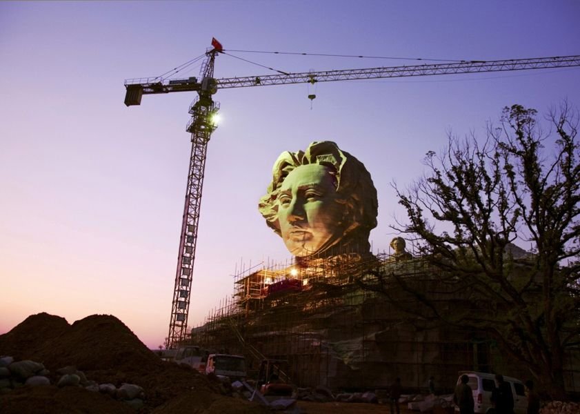 摄于2009年11月22日。一座32米高的毛泽东青年艺术雕塑在长沙橘子洲头建造。毛泽东的形象也频繁出现在现代艺术作品中。