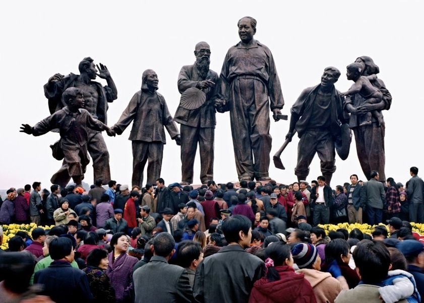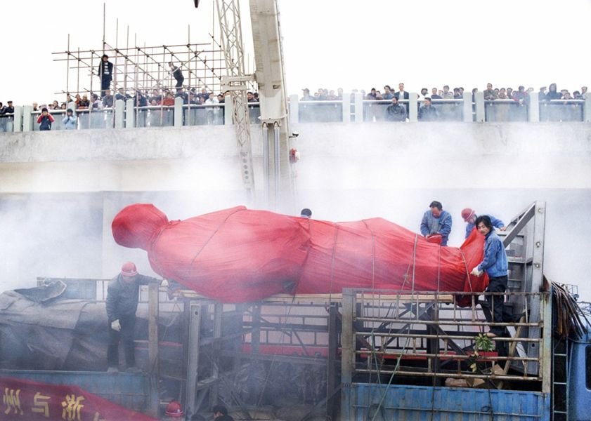 摄于2005年5月12日。当毛泽东的巨大铜像被运回家乡,人们自发走上街头进行庆祝。