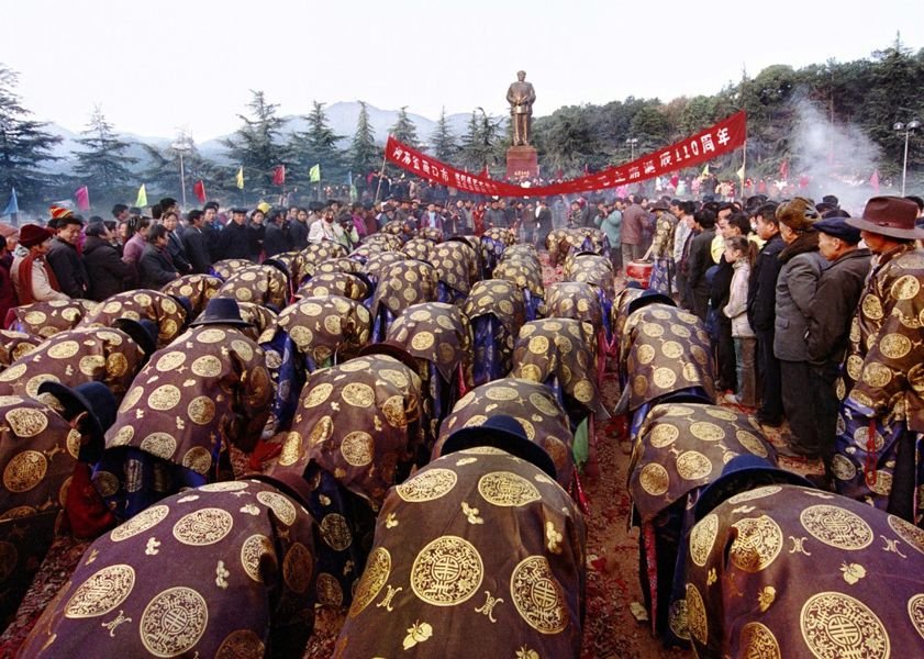 摄于2003年12月26日。这天是毛泽东诞辰110周年。湘潭村民们身着传统服装,举行纪念活动。