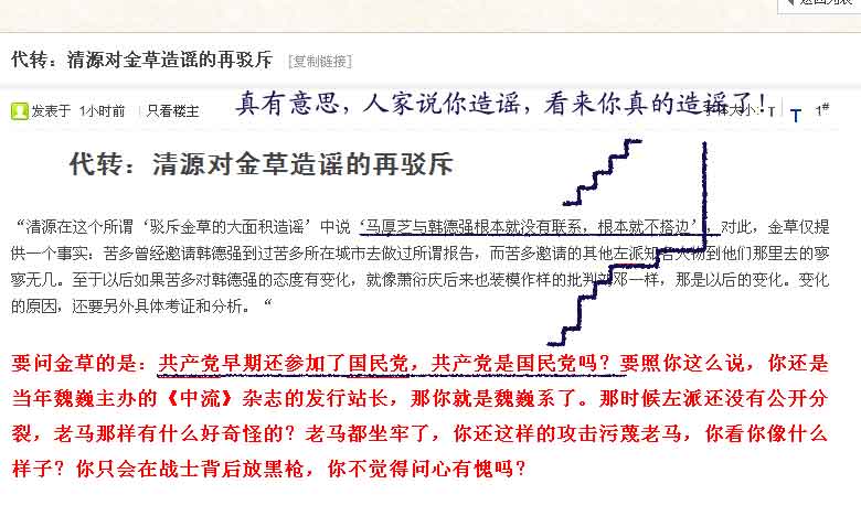 “清源在这个所谓‘驳斥金草的大面积造谣’中说‘马厚芝与韩德强根本就没有联系,根本就不搭边’,对此,金草仅提供一个事实:苦多曾经邀请韩德强到过苦多所在城市去做过所谓报告,而苦多邀请的其他左派知名人物到他们那里去的寥寥无几。至于以后如果苦多对韩德强的态度有变化,就像客观上你们就是内奸、奸细、五毛。劝你们不要再胡批魏巍而自绝与革命了。 红星 发表于 2012-3-7 12:42:00  |