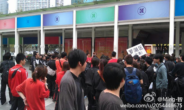 2012年3月16日,深圳福田区,数百名百丽集团旗下,领跑体育员工上街举牌游行,抗议工资过低。员工拿着大横幅:「抗议抗议,还我合法权益」,一路游行到福田劳动局,要求政府帮助解决。