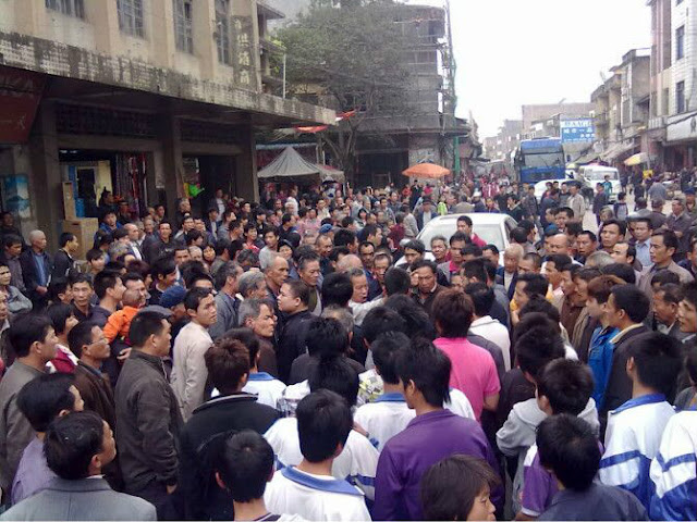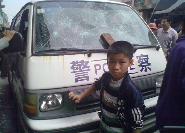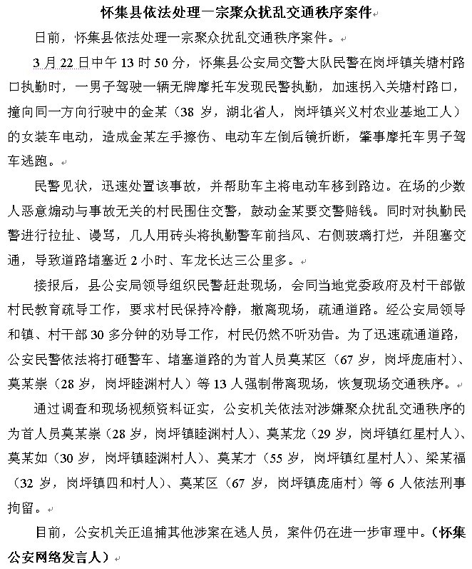 2012年3月22日下午2时,广东怀集县岗坪镇中心,交警不顾群众安危追捕无牌摩托车,导致交通意外,两小孩断手。民众与交警理论,交警不肯道歉,更打伤一老人,激起民愤,近千人围攻交警打砸警车。