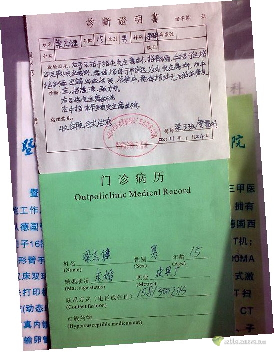 就在这样的城市里,2011年1月24日晨1点30分,在深圳龙岗区平湖镇凤凰社区,一间黑工厂一帮员工通宵加班,该工厂未满16岁员工梁志健,由于连夜通宵,睡眠严重不足,精神恍惚情况下,操作无任何安全措施的打孔机,由于导致右手食指,中指手指前一截切断,更可耻的是,事故发生后,工厂老板为节省治疗费用,竟然不是打120叫急救车,而是带着血流不止的员工,步行十几分钟去了几个小诊所,小医院治疗,在事故发生整整三个小时后,才送入专业的创伤医院,错过了最佳治疗时间,导致手指坏死,最后截除食指前部分,中指前节,造成永久性的残疾!
