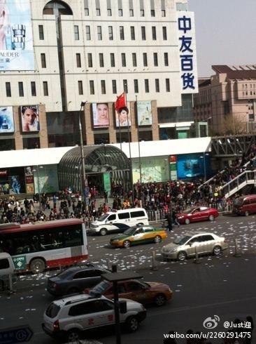 2012年4月3日下午,北京西单的行人天桥,两名上海冤民抛撒大量传单。传单飘得满街都是,汽车立刻慢下来,路人纷纷驻足围观,天桥上也站满了看热闹和照相的人。