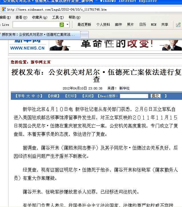 经复查,现有证据证明尼尔·伍德死于他杀,薄谷开来和张晓军(薄家勤务人员)有重大作案嫌疑。