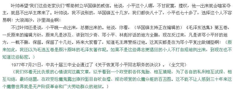 不过叶帅还是说,小平晚一点出来,总要出来的。他说,你看,(华国锋主持正在编辑的)《毛泽东选集》第五卷,一反原来的编辑方针,原来凡是涉及、讲到刘少奇、邓小平、林彪好话的地方全删;现在反过来,凡是讲邓小平好的地方,一概不删,保留。保留了十几处。将来大家看了,知道毛主席赞扬过他。这其实都是在为邓小平复出做铺垫啊!(原来如此,我还以为毛选五卷是原汁原味的毛泽东著作呢。如果不是这些得志更猖狂的小人不打自招地供出来,到现在也不知道这些秘密。)