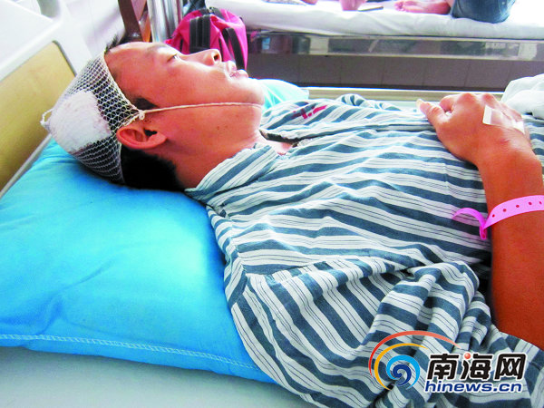 4日下午,记者来到琼山人民医院颅脑外科病房,见到了被打伤的城管队员老林,老林头部包扎着纱布,头部伤口缝了6针,所穿的制服的一大半都被鲜血染红。