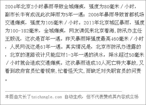 『我们查证资料显示,北京领导每逢暴雨,就责怪天灾,说什么多少年不遇,却从不检讨自己执政的失职,而且从来不做改进,因为真实状况就是北京道路设计只能承载50毫米降雨。长期不改进的结果终于造成了这次10人死亡的特大事故,我要求严惩失职官员』
