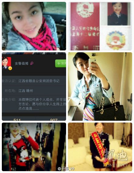 今日新浪认证用户@女警薇博 注册信息为:江西省赣县公安局团委书记,删除了自己的微博,并去V认证。此事起因为一段视频:《扫黄现场小姐裸身遭讯问失声痛哭》http://t.cn/zWIylKh 该女警称:”当警察面就失声痛哭,当嫖客面怎么不哭呢?“引起质疑,并在其微博内有大量炫富照片。