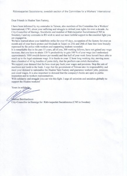 发起座谈会的工人国际委员会(CWI)台湾支部同志也在现场亲手递交工人们来自瑞典斯德哥尔摩市议员Mattias Bernhardsson给华隆工人们的声援信,希望透过各国工人们的串联声援与抗议资本家的行动要求台湾政府正视工人们的权益,并提出了国有化华隆纺织,由华隆工人民主管理华隆纺织等诉求。