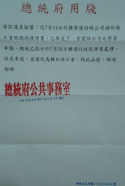 事实证明,政府只是再一次地戏弄了工人,所谓的回应只是再一次地表达了他们坚持袖手旁观的决心。而「检调」在国际声援活动发起之后的紧张反应,更显示出他们重视「国际观感」更甚于「人民观感」。华隆工人北上台北抗议,换来了官员的敷衍。我们发动国际声援,虽然在一周内得到了来自4个国家1个工会的声援,但也只换得检调的威胁电话跟一张来自总统府的垃圾回函。这告诉我们,目前的努力还不够,我​​们需要更多的行动与动员工人和青年支持,来反击国民党政府的挑衅。
