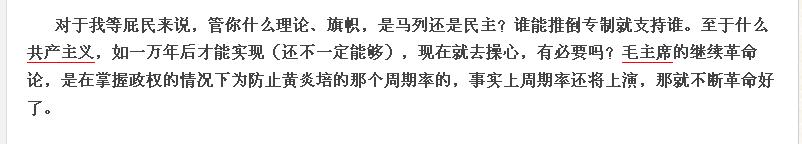 对于我等屁民来说,管你什么理论、旗帜,是马列还是民主?谁能推倒专制就支持谁。至于什么共产主义,如一万年后才能实现(还不一定能够),现在就去操心,有必要吗?毛主席的继续革命论,是在掌握政权的情况下为防止黄炎培的那个周期率的,事实上周期率还将上演,那就不断革命好了。