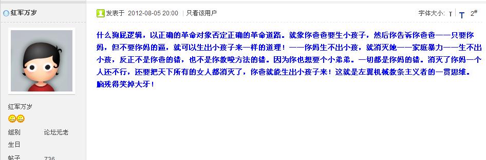什么狗屁逻辑,以正确的革命对象否定正确的革命道路。就象你爸爸要生小孩子,然后你告诉你爸爸——只要你妈,但不要你妈的逼,就可以生出小孩子来一样的道理!——你妈生不出小孩,就消灭她——家庭暴力——生不出小孩,反正不是你爸的错,也不是你教唆方法的错。因为你也想要个小弟弟。一切都是你妈的错。消灭了你妈一个人还不行,还要把天下所有的女人都消灭了,你爸就能生出小孩子来!这就是左翼机械教条主义者的一贯思维。