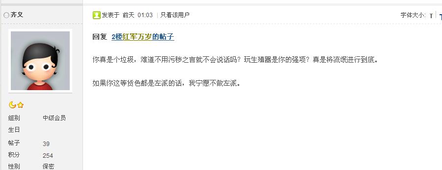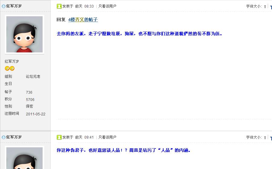 红军万岁这个人对不同政见之网友一概以低级下流污秽不堪之语言进行攻击。在《浅谈左翼“内部”的三种主张》一文中表现的尤为之甚。望版主恢复其污秽之贴以证其言。