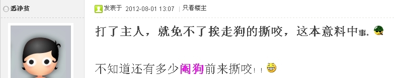 在悉净贫网友的主贴中第一个回帖就对其无端的以极其下流无耻之语言进行攻击。我作为旁观者尚且难以容忍,更何况楼主本人。对如此宵小之人采用什么处理方式那是管理层的事儿,驱逐仅为个人建议,管理层可以用认为适当的方式予以处理,但毫无反应的漠视就等于放纵和支持。
