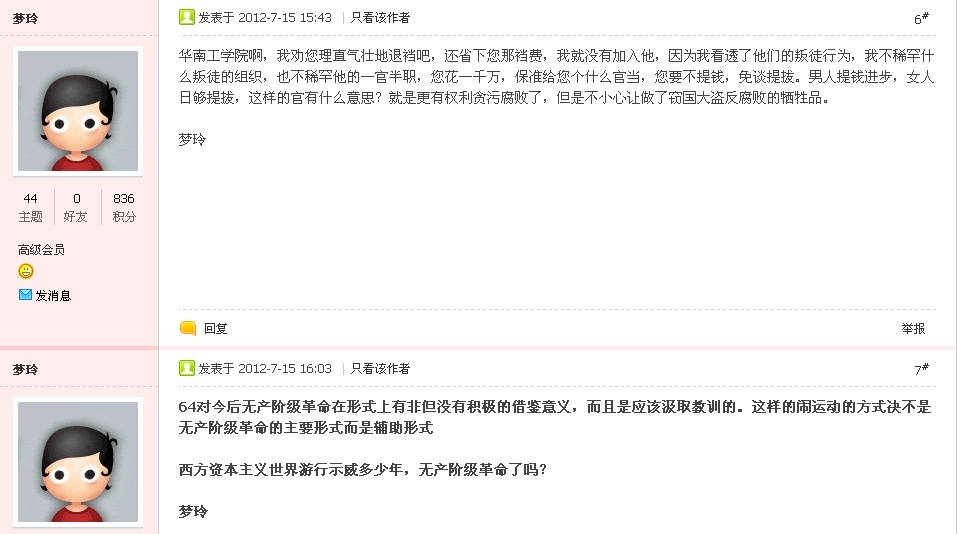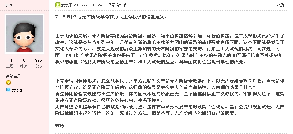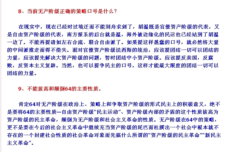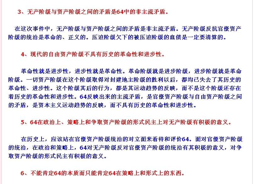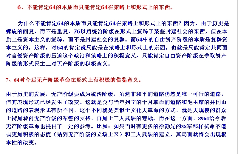 “6.4”运动中民众的各种政治诉求中到底是那一股政治诉求占运动的主要地位,你到底看清楚了没有?今天在这里自淫。运动中的马列毛主义社会主义意识诉求的实际状态是你今天靠自己的主观愿望想拔高就高起来了?