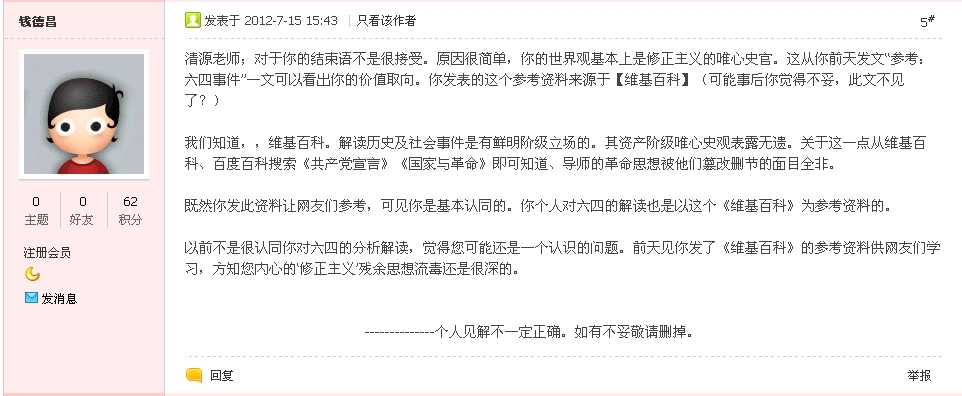 清源先生不顾修正主义上台搞的是最坏的资本主义的事实,顽固地站在反对人民、反对革命的立场,不遗余力地为修正主义统治集团平息6.4辩护,甘当统治阶级的打手和帮闲,已经堕落到近乎无耻的地步。