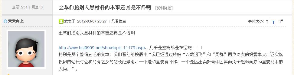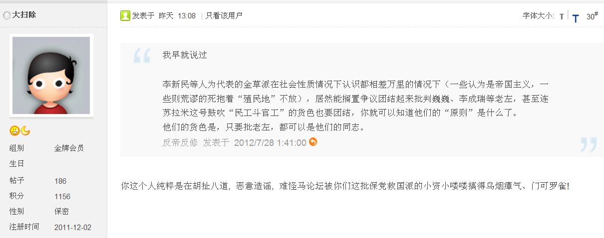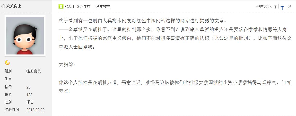 | 不过,  象“天天向上”这样的人,  充其量也不过是一个小资小喽罗,  同样是资本主义雇佣劳动制下为生存而奔波的奴隶,只不过是为了多得到几根骨头而为资产阶级卖命而己!  这种人其实就是厚颜无耻的奴才!  他们不懂得不消灭私有制,  他们的后代也必定是奴隶,而且世世代代是奴隶这样一个道理!大扫除 发表于 2012/8/12 20:03:00