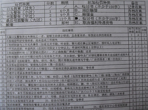 上图 伟创力的110条厂规厂纪(部分)和纪律处罚告示栏