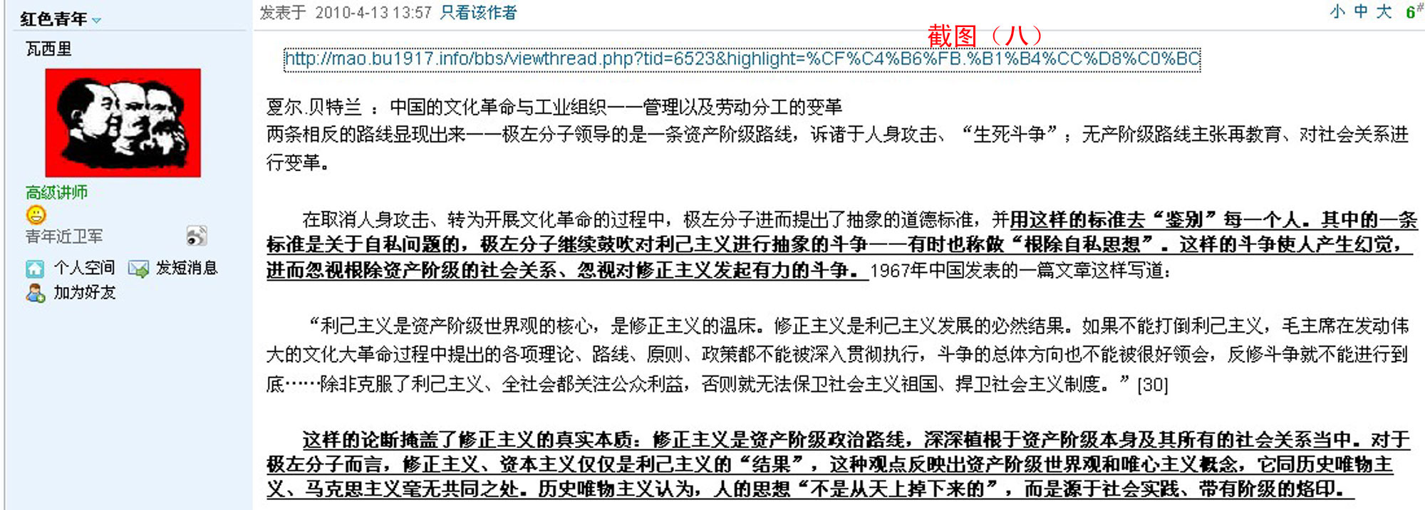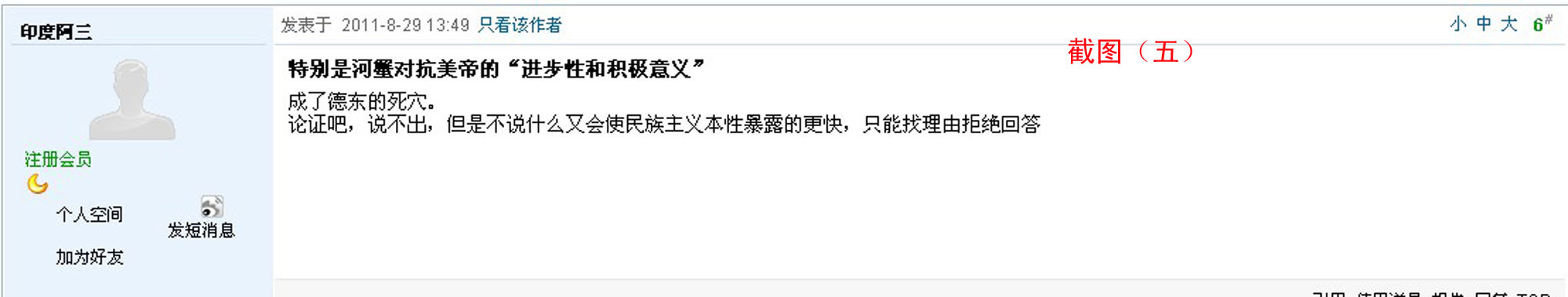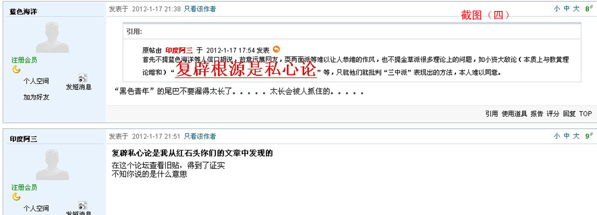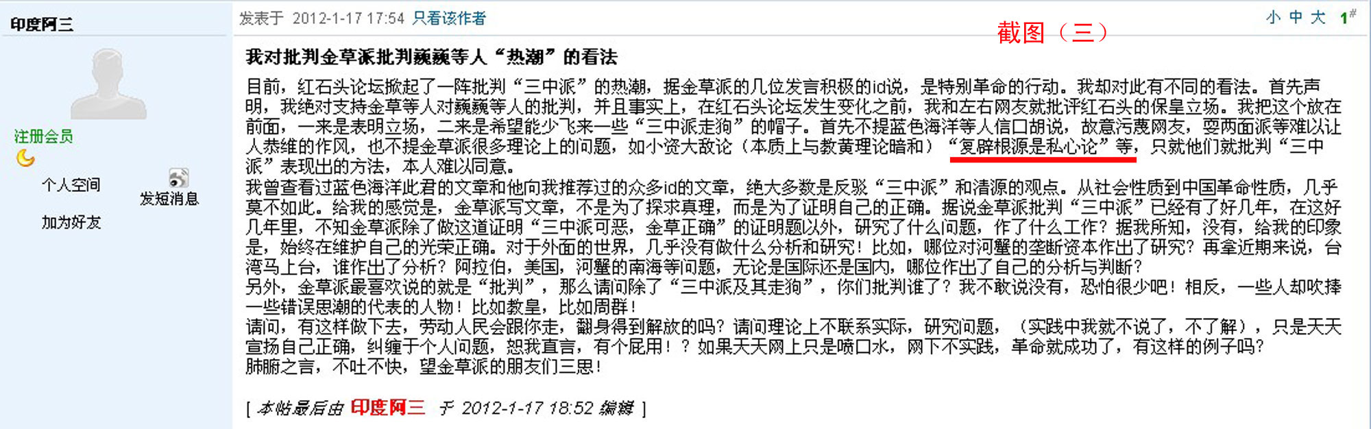 证据二:发帖内容。自2010年3月以来,一直到金草等人的文章能在红石头论坛发出来之前这段时间里,反复与本人纠缠“复辟根源是私心论”这一问题的就只有红色青年一个人,其次就是流氓阿三。印度阿三如果不是红色青年,他决不可能知道本人曾经论述过“私有观念作为一种社会存在,是资本主义复辟的客观原因之一”这一问题。见截图(三)