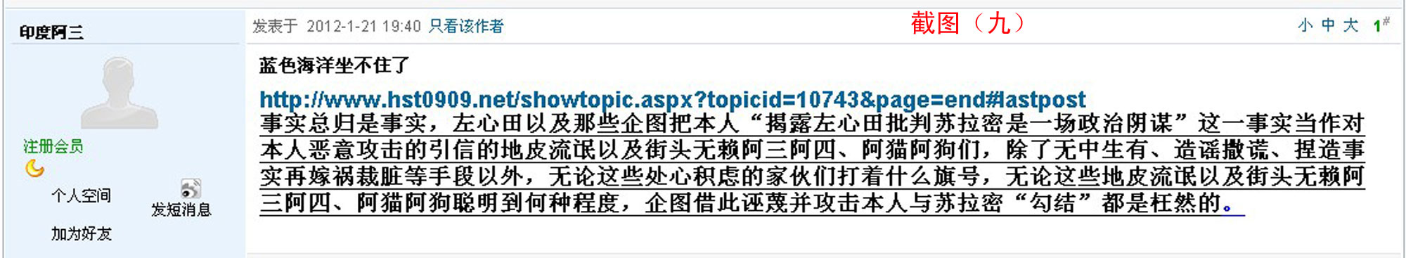 本人那句话是因本人对冬子(有所思)也就是黄钺的观点存在某些分歧。希望流氓阿三把他的观点系统地写出来,没想到却因为这句话得罪了他。从那以后,流氓阿三就经常以所谓的”复辟私心论”向本人挑衅,因为本人赞同批判苏拉密的错误观点,反对全盘否定和全面批判苏拉密,流氓阿三就诬蔑攻击本人“没有原则,玩弄手段,没有道德”,说一套作一套、耍两面派、纠缠个人恩怨,搞极端宗派主义。在长达两年半之久的时间内通过马列毛主义论坛和红石头论坛发表诬蔑攻击本人的帖子不下百余。直到目前,流氓阿三还在不断寻找各种样的理由向本人挑衅,诬蔑攻击“没有原则,玩弄手段,没有道德”。大有不获全胜,决不收兵的架式。