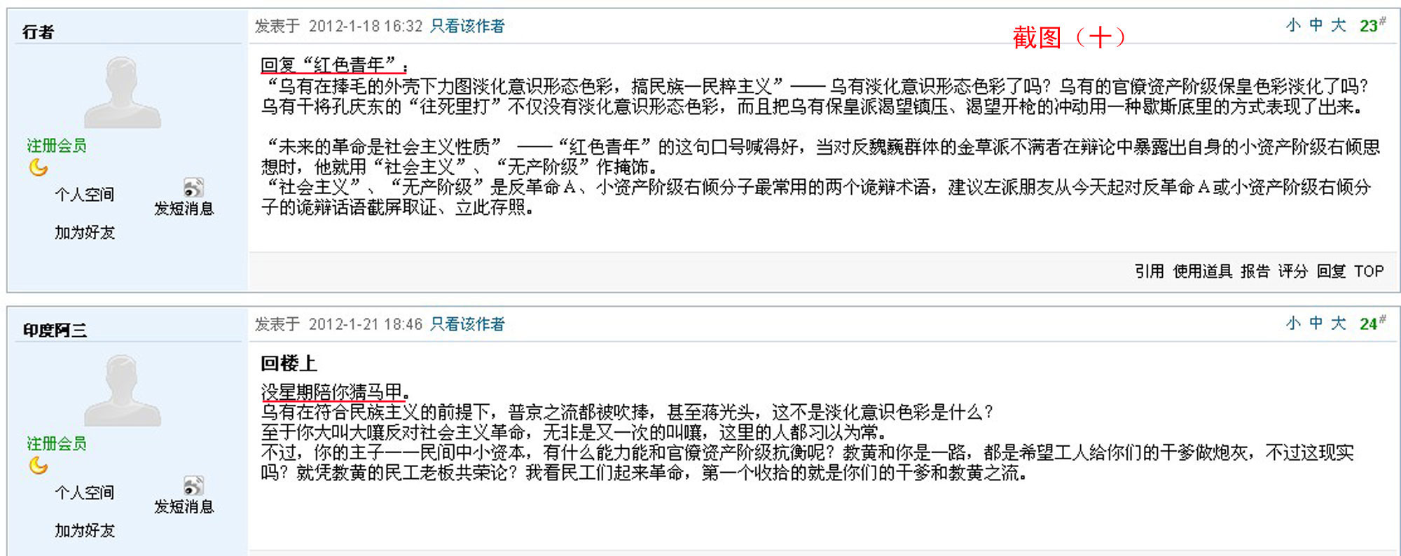 证据五:行者,既林二一也认为流氓阿三是红色青年。但流氓阿三的否定依然没有丝毫底气。见截图(十)。