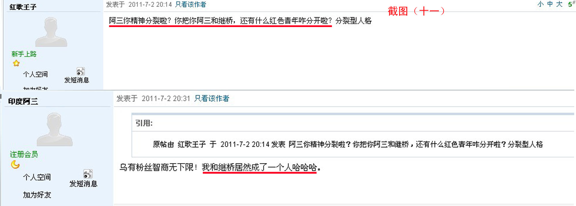 证据六:红歌王子也认为流氓阿三就是红色青年,并发帖质问“你把你阿三和继桥,还有什么红色青年分开啦?”谴责流氓阿三故意把自己这些马甲当成不同的人属于“分裂型人格”。但是流氓阿三只否定“继桥”这个马甲不是自己,却没有否定流氓阿三与红色青年不是一个人。见截图(十一)。