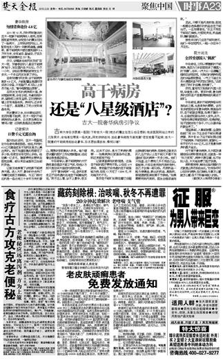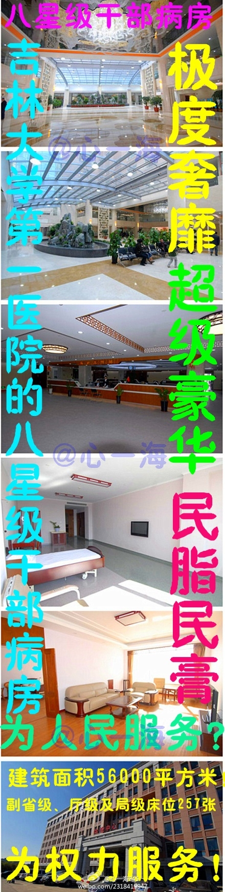 吉林大学第一医院豪华干部病房去年10月16日正式营运了!耗资4亿8千万!建筑面积5.6万平米!设省级、副省级、厅级、局级床位257张!内部配置全是国际顶级进口设备!护士年轻貌美提供“全方位立体服务”!网友们说:“官员领导们日理万机,需好好调养,他们为了今天的“”幸福”付出了青春年华,只有好好享受静养,以后才能更好的“为人民服务” ?