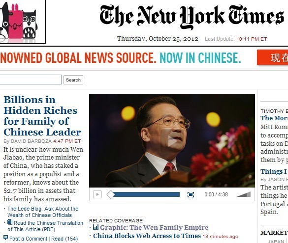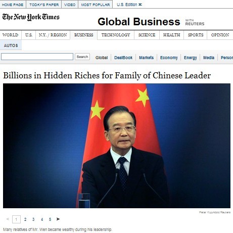 http://news.backchina.com/viewnews-218106-gb2312.html纽约时报罕见地在首页发表文章揭露中国的政改总理温家宝的家族发财史。从其90岁的老母到其兄弟、老婆、儿子甚至同事朋友都神奇地成为亿万富翁。温家宝不再是那个在全国老百姓面前叫穷的中国总理。
