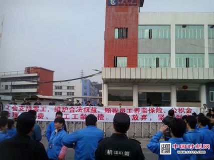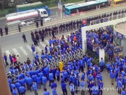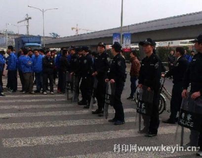 员工堵塞工厂大门口,并挂上大横幅:“工会支持罢工,维护合法权益,赔我员工养老保险、公积金、合理加餐费、员工工龄补偿。绝不放弃,坚持到底!”大批警察到场戒备,防止工人上街。