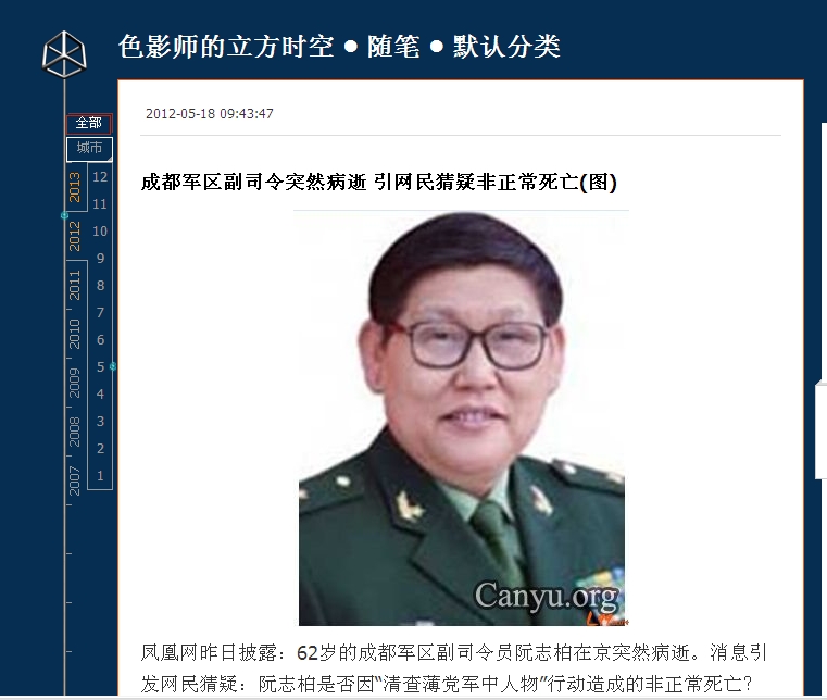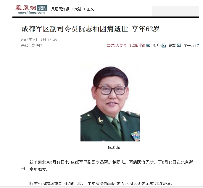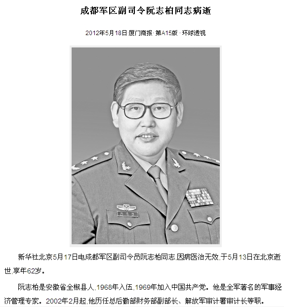 6、2012年5月13日;蓉城军区副司零阮志柏在北京病死......