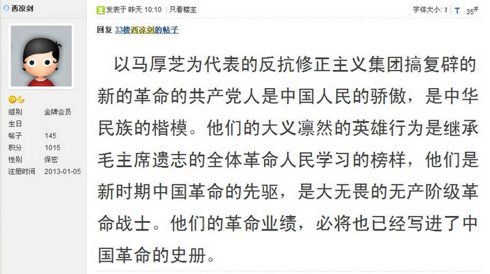 既然西凉剑先生不敢面对他的几个谬论被彻底驳斥的事实而不知羞,顽固地不承认错误,还继续口口声声大叫什么做革命实事,我再对此表明一个看法:不让批判三中全会派,不让清算魏巍一伙多年来打着革命旗号对革命的破坏,不让揭露三中派在马厚之事件中的破坏罪恶,不把在这些破坏中的五毛资产阶级分子揭露出来,不让分清这些阶级和路线、思想的是非,不让总结其中的经验教训,而口口声声的继续大喊革命,继续对批判改革开放路线和三中全会派的金草等网友进行恶毒的造谣谩骂污蔑攻击,这是继续坚持过去的政治阴谋,其最后只能是再造成马厚之事件那样的破坏。呼吁各位真诚信仰马列毛思想和反对资本主义复辟的同志,对西凉剑及其一伙的政治阴谋保持高度警惕。否则,勿谓言之不预也。