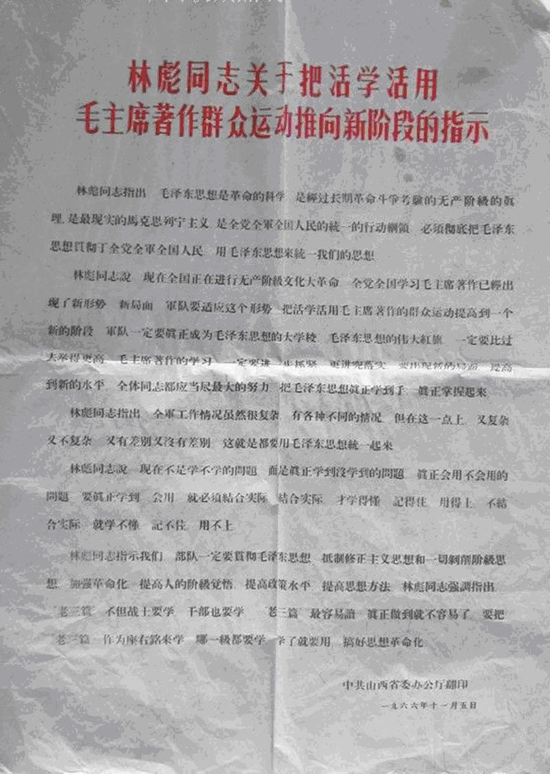 “活学活用”这个概念是由林彪在1966年文化大革命之初提出来的,之后才在社会上广泛流传。林彪提出“活学活用毛泽东思想”的目的不是为了让人们学懂弄通马列主义和毛泽东思想,而在于以左的形式为自己谋求政治资本,最终为他篡夺党和国家最高领导权服务。现在,问题不在于林彪的话我们能不能使用,而在于西冰剑歪曲历史事实,把林彪为了捞取政治资本而提出来的“活学活用毛泽东思想”歪曲为“文革后期的群众创造的”,借以达到他打着马列毛主义旗号欺骗不了解社会主义革命历史的年轻学生和工友们。在西凉剑那里,林彪也成为“群众”了!