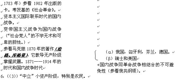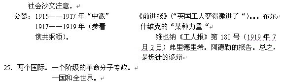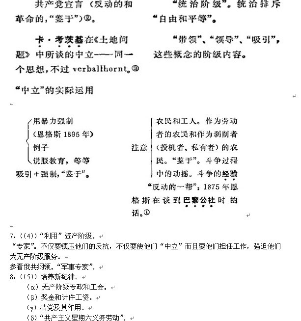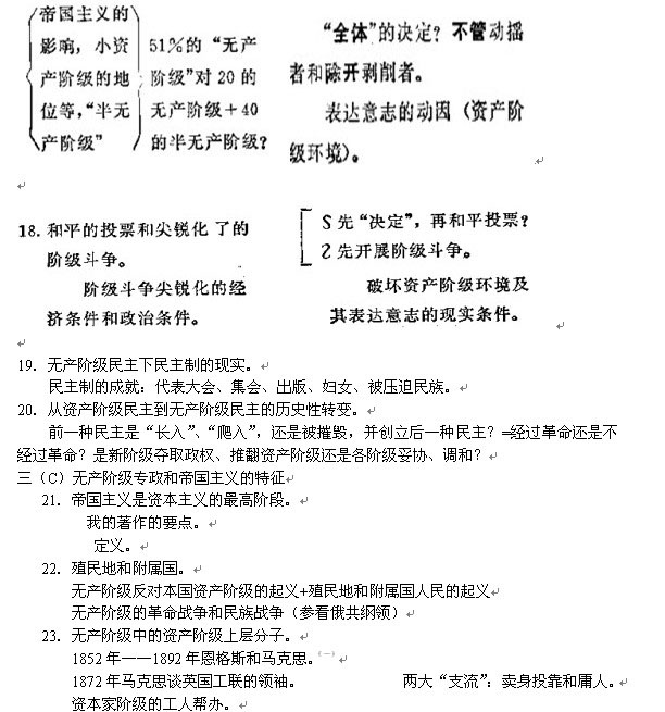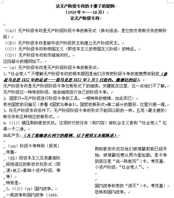 需要说明的是,导师的提纲不但有个文字表达的问题,还有个文字空间布局的问题,我不得不先排好版,之后用截图的方式提供给大家,能够尽量用文字的地方我尽量用文字表达。但是,我还是忽略了一些加重符号,有条件的同志还是阅读原著为好,原著在《列宁全集》第37卷。其次,为了方便大家阅读,我把列宁提到的有关马克思、恩格斯、考茨基的著作用夹批的形式标注了出来,字体用斜体加粗并加下划线和正文区别了开来。比较重大的复杂的注释我选了两个,分别在最后给出。有需要DOC文档的同志可以下载附件。WORD文档