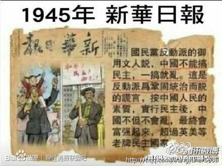 中国的缺点,一言以蔽之,就是缺乏民主。 ……政治需要统一,但是只有建立在言论、出版、结社的自由与民主选举政府的基础上面,才是有力的政治。——毛泽东答中外记者团 《解放日报》19446月13日