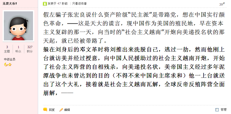 谢谢删除多余图片。同时回复管理员 admin :你将这个帖子移入“改良派之声”我不敢苟同,请看文后主席关于民主的论述,莫非他也是改良派?现在谈民主,不但不是改良,而且是突破当局维稳包围,结成最广泛的统一战线,为今后的革命作最必要准备。一场革命,总要明确联合的对象、斗争的对象,和斗争的方向,推翻官僚资产阶级的革命必然是民主革命,和主席当年一样,民主也必然是这个革命阶段的目标,确定这些,是革命成败的关键一环。资产阶级民主派尚且已经不是改良派了,他们明确提出反政府包括推翻政府的口号,无产阶级革命派怎么可能是改良派呢,无产阶级的民主需求即使在主席领导的无产阶级专政下继续革命的文化大革命中还在不断增长强化:破除5000年封建奴化教育,树立造反有理,反抗压迫的主人翁意识不就是民主教育和民主洗脑,直到达到了群众运动的最大民主,不是吗?可以说民主是无产阶级革命自始至终追求的目标。无产阶级民主派不是改良派,是革命派,革命的实际操作比口号来得重要。