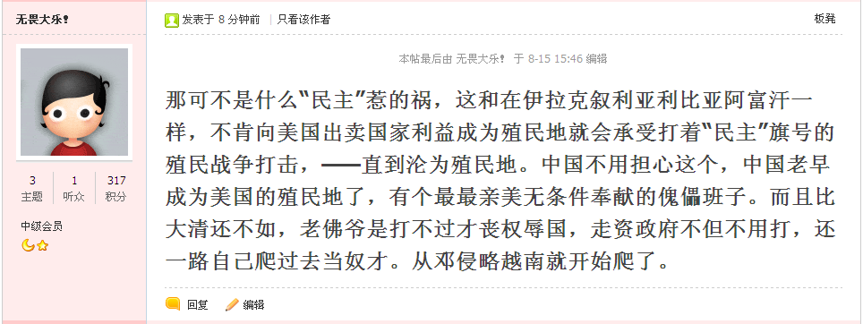 作为殖民地世界工厂,中国人民饱受资源枯竭、环境污染、资本掠夺的重重苦难,喝毒水,吃毒食、吸毒霾、吃转基因灭种毒粮可是不分阶级,只要不肯亡国灭种的所有中国人都应该团结起来,推翻殖民地傀儡政权,保我华族,延我血脉··