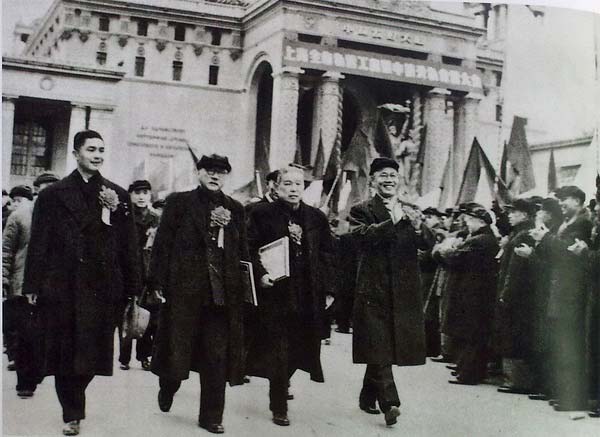 1954 上海资本家集会,申请政府对其私有产业进行“公私合营”。(左一:荣毅仁)