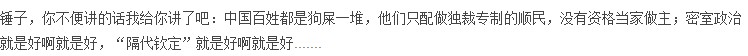 锤子,你不便讲的话我给你讲了吧:中国百姓都是狗屎一堆,他们只配做独裁专制的顺民,没有资格当家做主;密室政治就是好啊就是好,“隔代钦定”就是好啊就是好.......